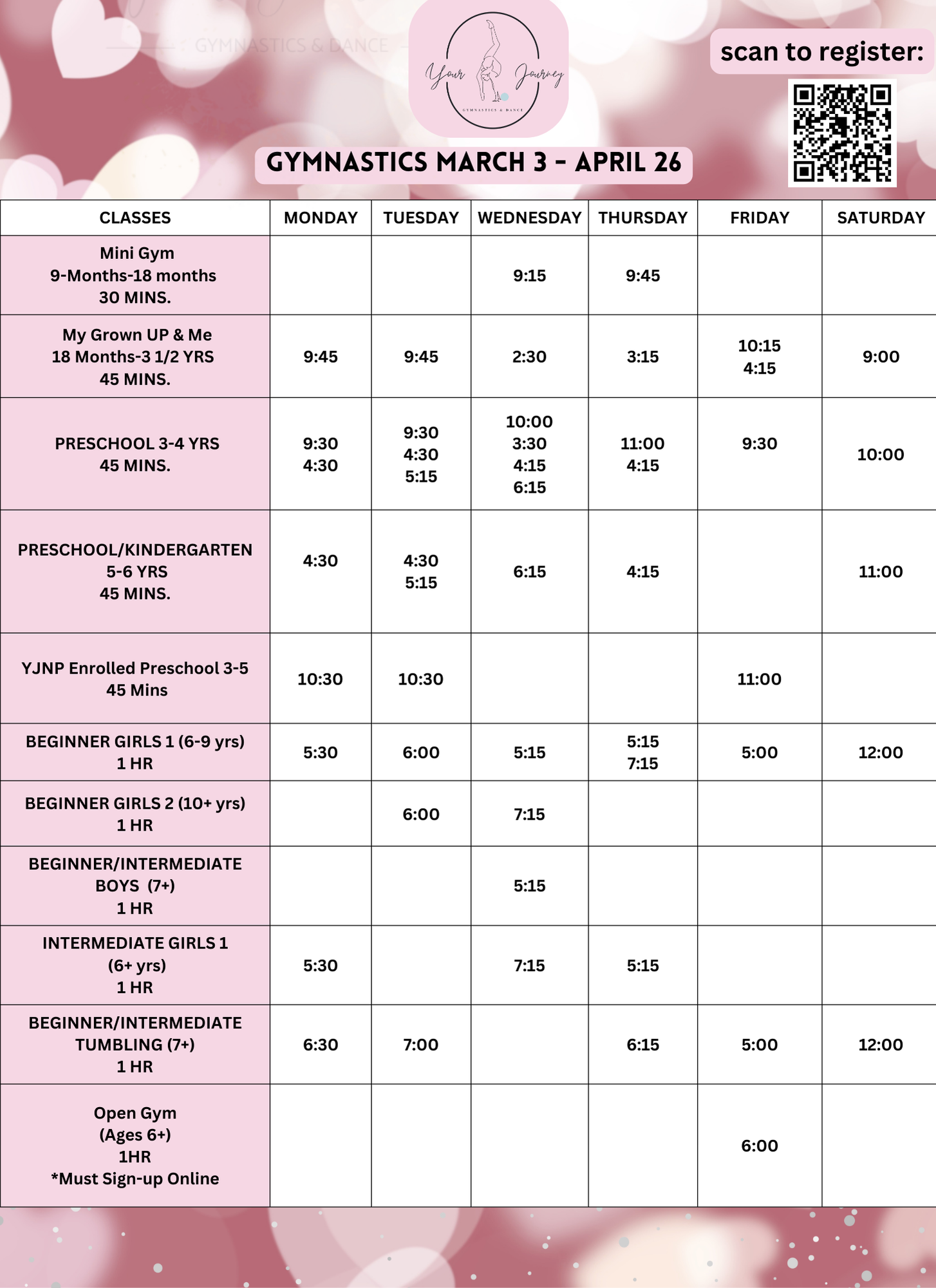 For excused absences (family emergencies, sickness, injuries, etc.) Please email: yourjourneygym@gmail.com
